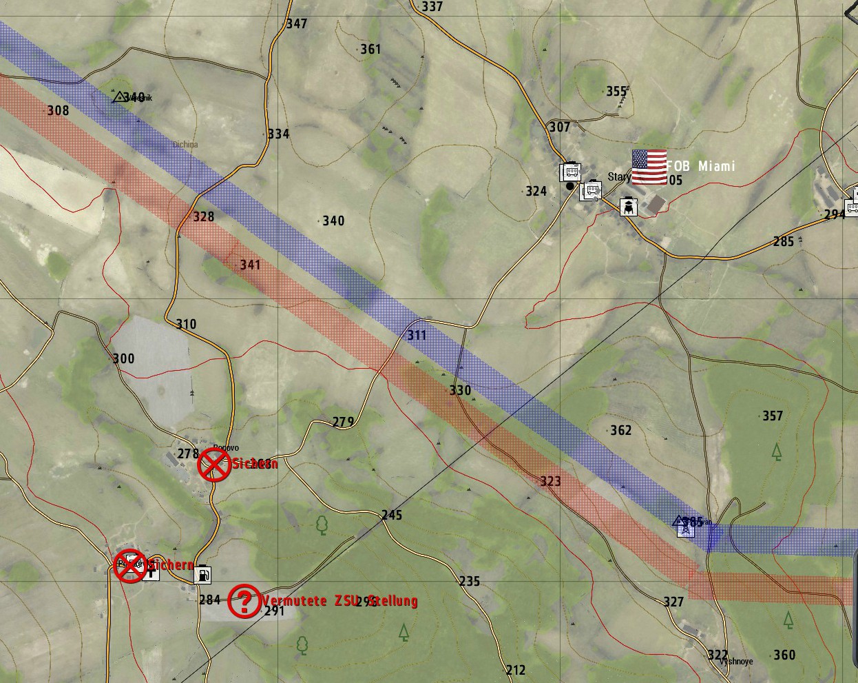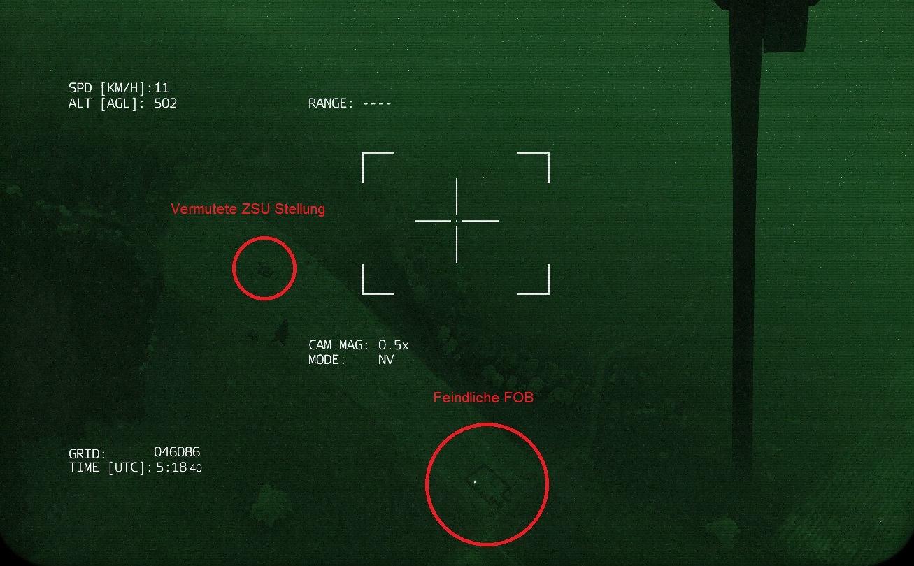 Außerdem wurde eine feindliche FOB Aufgeklärt, diese befindet sich etwa 150 Meter westlich der ZSU Stellung. Durchsuchen Sie diese Stellung nach Informationen und befreien Sie eventuelle Geiseln.