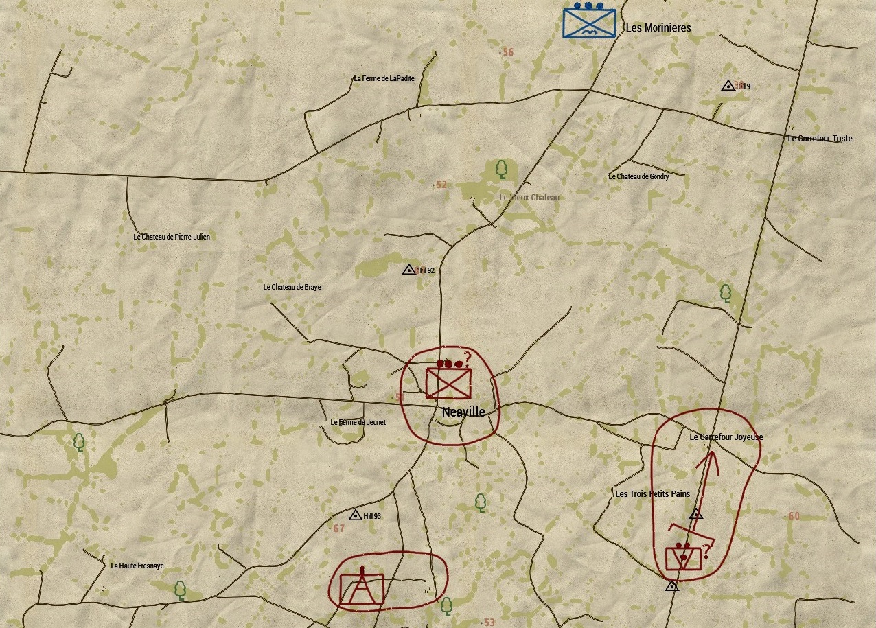 Bei einem Aufklärungsflug der Air Force ist wenige Kilometer südlich der Ortschaft Neaville eine noch aktive Flugabwehrbatterie der Deutschen aufgeklärt worden. Hierbei handelt es sich wahrscheinlich um eine der letzten noch nicht zerstörten Batterien eines von der Luftwaffe provisorisch eingerichteten Flakgürtels, der sich quer durch die Normandie erstreckt. Einer Kompanie der 101st Airborne, die sich nurnoch wenige Kilometer vor Neaville befindet, wurde der Auftrag gegeben, die Batterie zu zerstören, bzw. kampfunfähig zu machen. Desweiteren deuten vereinzelte Aufklärungsergebnisse darauf hin, dass ein feindlicher Zug Infanterie während der Rückzugsbewegung seines Verbandes in Neaville pausiert hat, um vermutlich die Sicherung der Flugabwehrstellung zu verstärken, sowie die strategisch wichtige Kreuzung "Carrefour Joyeuse" im Osten Neavilles zu kontrollieren.