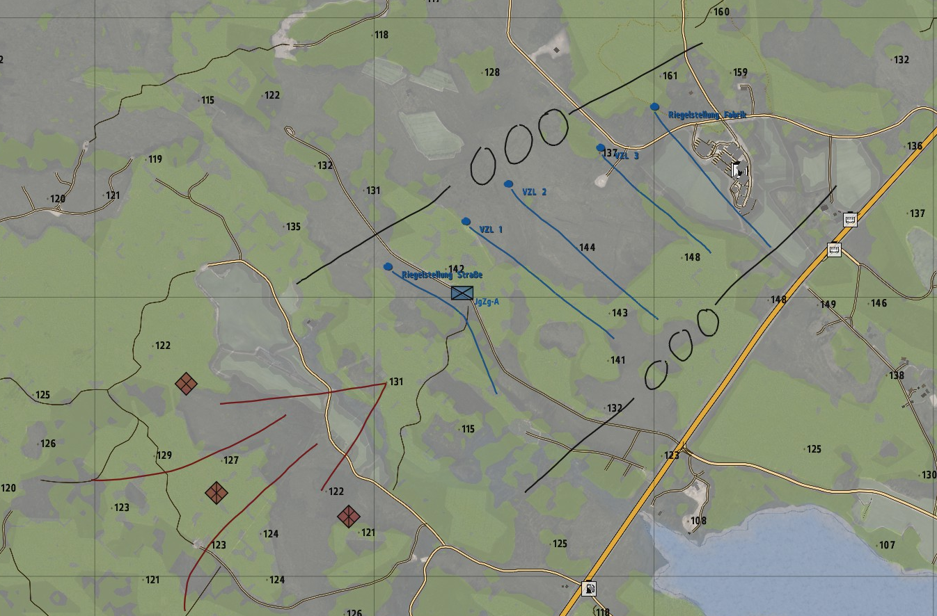• Der JägerZug Achilles I bezieht Riegelstellung Fabrik und hält diese. Stellungen wurden von den Pionieren bereits vorbereitet und sind zu beziehen. Auch auf Ausweich- Ersatz- und Wechselstellungen ist zu achten.