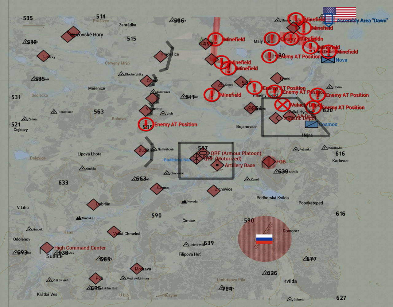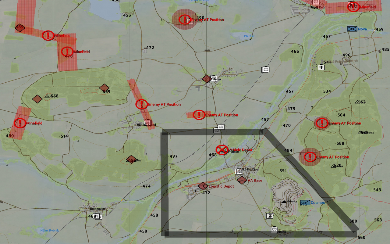 Der Feind hat sich schwerpunktmäßig in Velke stationiert. In Velke befindet sich eine Flugabwehrstellung mit angegliedertem Logistik-Depot.